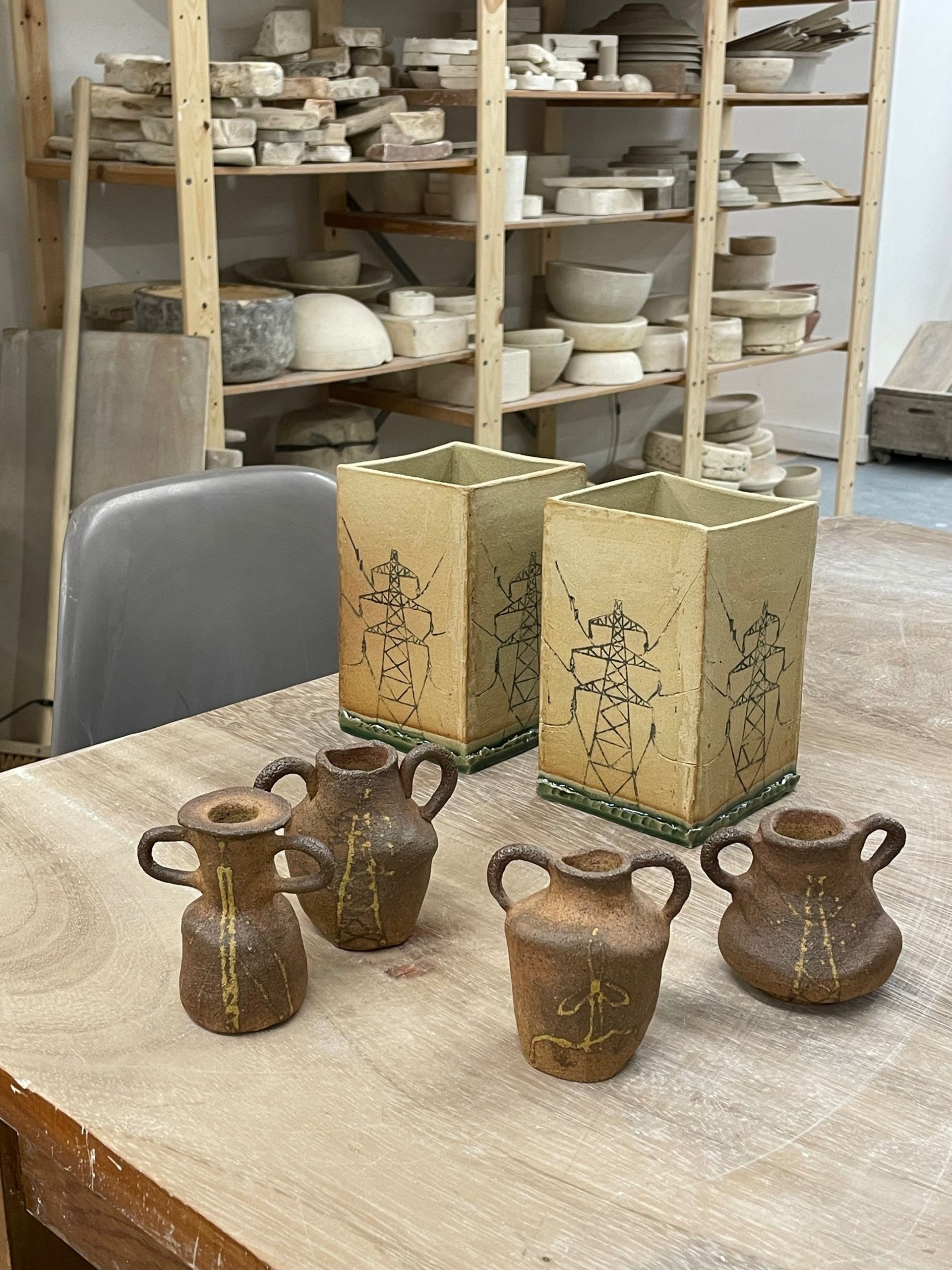 My work is deeply influenced by my rural upbringing in the Yorkshire Dales and subsequent adjustment city life: Combining clay, printing and illustration, I convey feelings of existential curiosity towards our ever-changing landscapes. I create imagery that teeters on the boundary between rural, industrial and urban environments, such as pylons, turbines, radio towers and cranes. I use these monolithic icons to represent the point at which these seemingly contrasting planes cross over, interrupt and collapse into the ordinary.